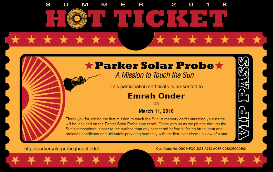 Siz de adınız Güneş’e göndermek istiyorsanız tek yapmanız gereken bu bağlantıdan (http://parkersolarprobe.jhuapl.edu/The-Mission/Name-to-Sun) tamamen ücretsiz olarak başvurmak. Ad, soyad ve email adresi bilgilerini içeren basit bir formu doldurduktan sonra geriye mail adresinize gönderilen doğrulama iletisindeki linki tıklamanız yeterli. Sonrasında yukarıdaki gibi bir sertifika oluşturuluyor.